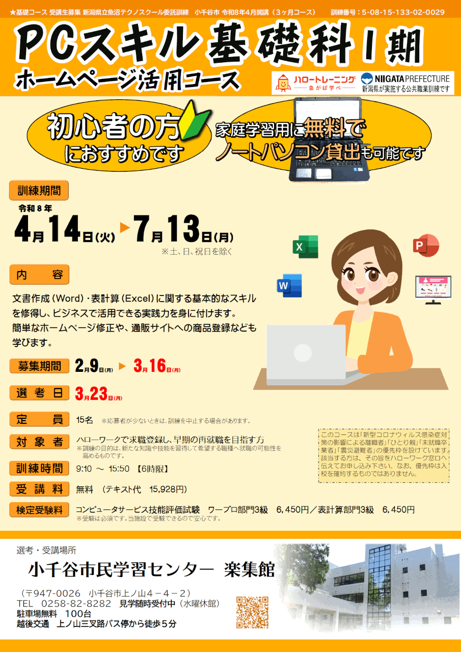 ワード、エクセルを中心にPCスキルを身に付け、資格を取得して再就職を目指します。